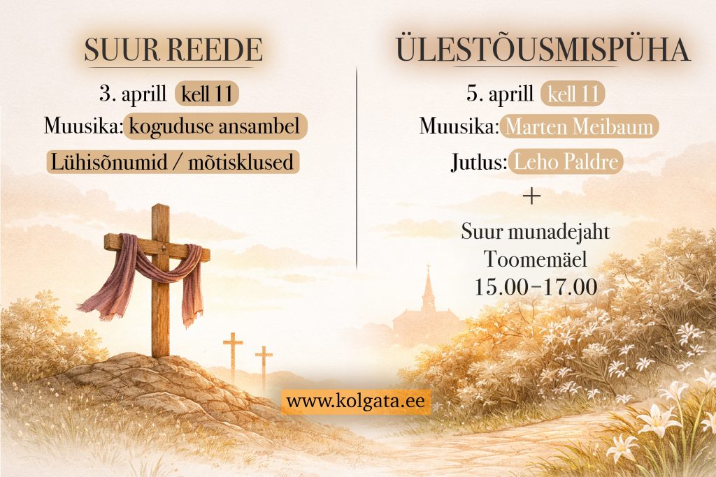 Suure reede jumalateenistus 3. aprillil kell 11. Vaimulikud lühisõnumid, aeg isiklikuks palveks. Elav muusika koguduse ansambilt.